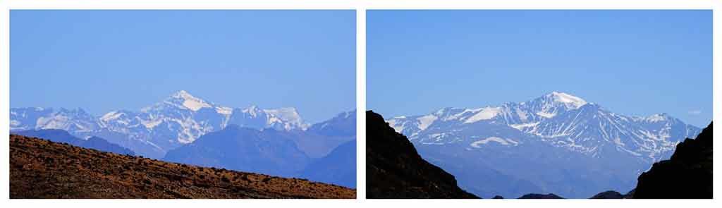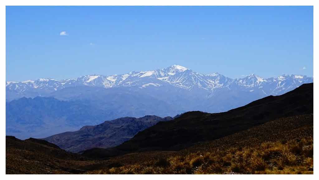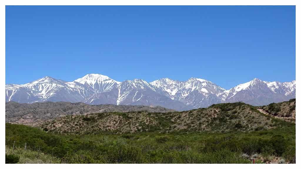 A une centaine de km de Mendoza en direction d’Uspallata, des sommets culminants à plus de 6000 m dont le mythique Aconcagua (6959m) la plus haut sommet d’Amérique, et le Cerro Mercedario (6770 m). Superbes montagnes aux neiges éternelles sous un ciel bleu azur, le top !!!