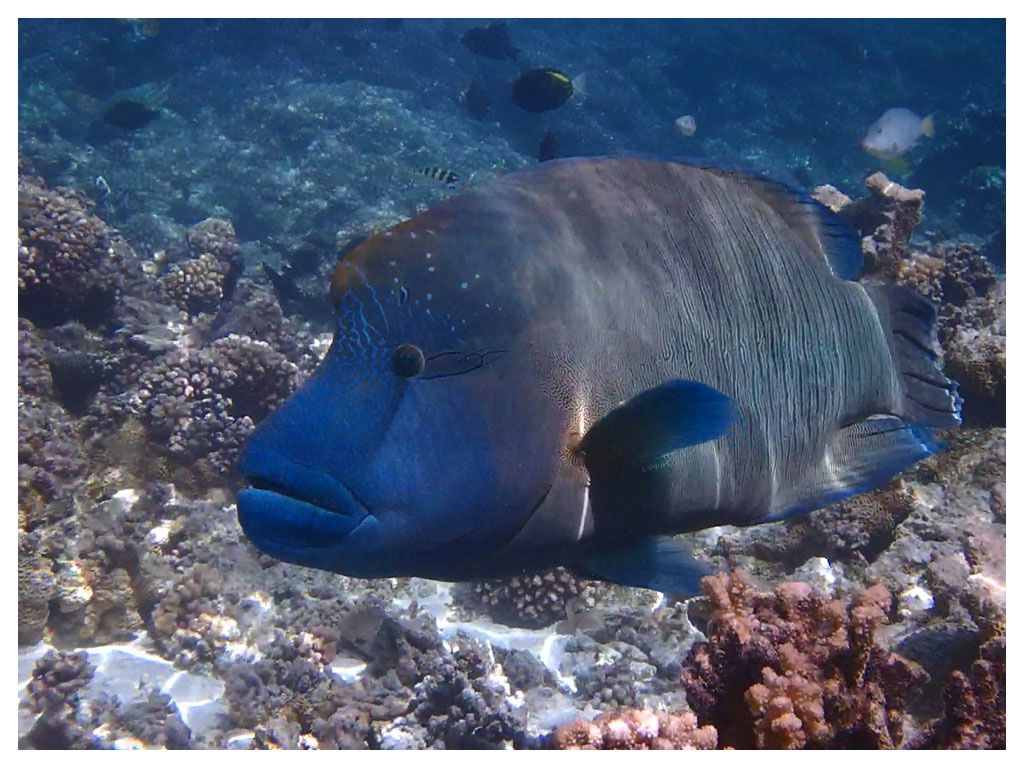 The last but not the least : Un gros Napoléon séjourne dans l’eau proche du village de Tetamanu. Belle bête qu’ils nourrissent affectueusement. Il remplace Calin-calin son prédécesseur encore plus gros dégommé au fusil sous marin dans 80 cm d’eau par un touriste. Autant dire que ce dernier n’a pas pu terminer son séjour au village !!