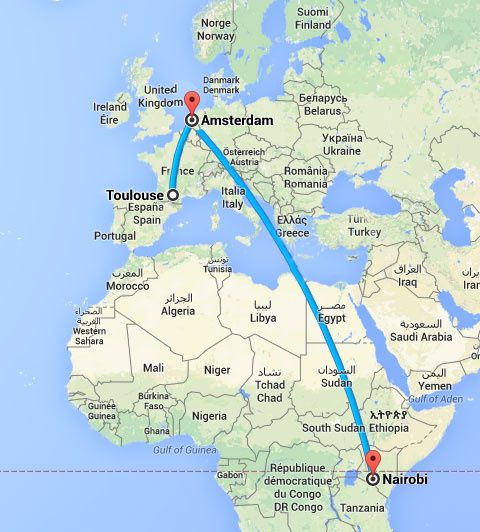 Une halte à l’aéroport Schiphol d’Amsterdam et nous redécollons à 21h avec Kenya Airways.
